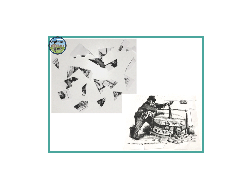 In class—divide your class into pairs or triplets. Send each pair/triplet to one of the “puzzles” with a pen or pencil. Once all the groups have their picture puzzle pieces and blank paper, tell them they need to arrange the pieces together to “solve the jigsaw puzzle.” Once they have the image put together, they should collaborate on a historically appropriate title/caption for the image and write it on the paper.